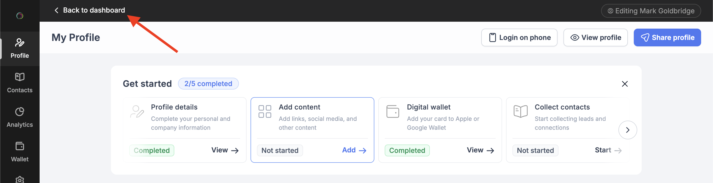 To return to your admin dashboard, click Back to dashboard in the top-left corner